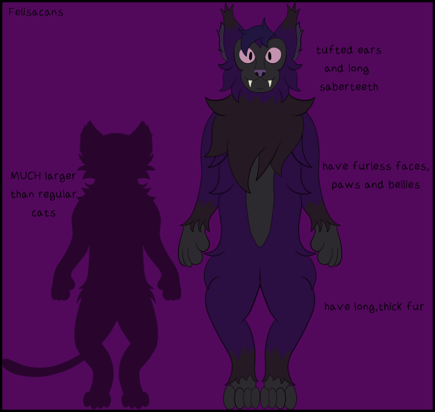 Felisacans are bulky felines with lynx, lykoi and sabertooth features giving them furless faces, paws and bellies, tufted ears, bobbed tails and saber teeth. However the trait they’re most known for is their ability to transform into a larger, more bestial form at will. How exactly they can do this as the ability to transform is one rarely seen.